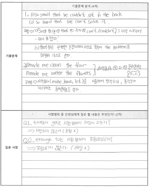 2학기 기말고사 시험범위 작성표 및 오답노트 우수자