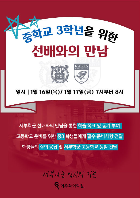 서부학군 입시의 기준 이주화어학원 입니다.2020년 중학교 3학년 학생을 대상으로 서울대학교, 고려대학교에 새롭게 입학한 선배들과의 만남을 준비 합니다.서부학군 고등학교 준비와 방향성은 학생들에게 큰 동기부여가 될 것 입니다.